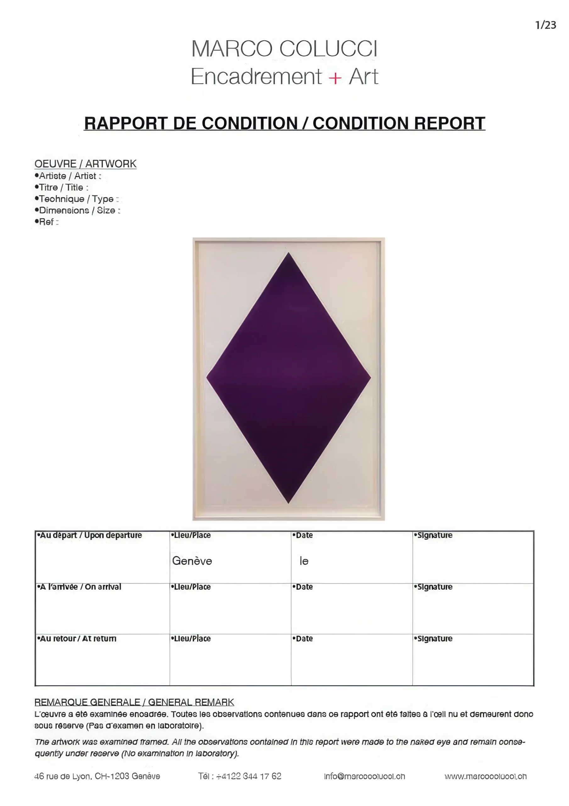 Qu’il s’agisse de garantir l’assurance pour le transport ou pour un prêt pour une exposition, nous sommes qualifiés pour établir des rapports de condition simplifiés ou détaillés de l’état général de vos œuvres. Ces rapports comprennent notamment un bilan photographique et le détail des spécificités de l’œuvre d’art. Si vous souhaitez en savoir plus, contactez-nous.